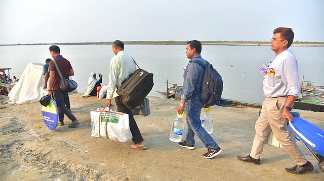 The char areas — low-lying river islands with no road access — have left officials with no alternative but to rely on inland waterways. Poor communication facilities further add to the challenge of deploying election personnel in these areas.