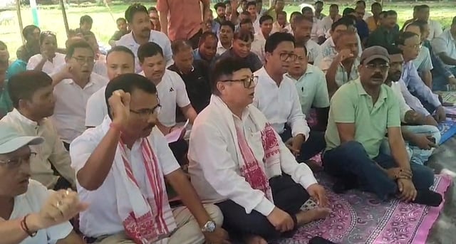 NAZIRA: The Congress party held a protest in Nazira on Friday against the alleged encroachment by Nagas in Uriamghat and Naginimora areas of Assam. The sit-in demonstration, organized by the Nazira Block Congress, was attended by prominent leaders, including Debabrata Saikia, Leader of the Opposition in the Assembly and MLA of Nazira constituency, and Ajay Kumar Gogoi, President of Sivasagar District Congress Committee, and others.