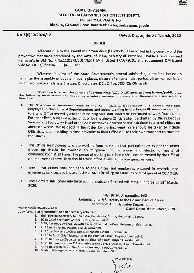 GUWAHATI: As a preventive measure to the Coronavirus outbreak, 50 percent employees from government departments in Assam will work from home on a rotation basis. A roster will be maintained and work will happen on a rotation basis.