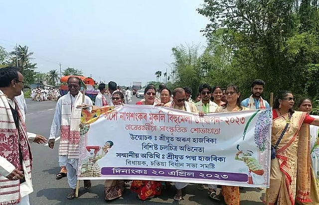 Eminent Assamese cine artiste Arun Hazarika inaugurated the cultural procession in presence of a gathering. The spectacular cultural procession was participated by nearly 5,000 people who proceeded through Natelia, Kacharigaon, Bora Chuk, Metera Gaon, Bebejia, Sola Sonari, Kumarkuri and Bahuwakuri. The procession concluded at Nagsankar. The Bihu programme began on April 16 with hoisting of the flag by Hitesh Barua, president of the Bihu celebration committee, followed by a series of traditional sports as well as literary competitions on April 17, April 18 and on April 19.