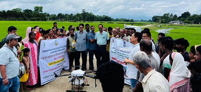 BISWANATH CHARIALI: A demonstration programme on the management of insect pests in paddy fields using drones was organized on Thursday at Pub Gingia village under Baghmari Development Block in Biswanath district. The event was conducted by the All India Coordinated Research Project for Dryland Agriculture (AICRPDA) in collaboration with the North Eastern Region Farm Machinery Training and Testing Institute (NERFMTTI), Biswanath Chariali, and the District Agricultural Office, Biswanath.