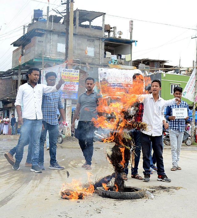 JORHAT, May 23: The Asom Jatiyatabadi Yuba Chatra Parishad (AJYCP) along with several other organizations burnt the effigies of Prime Minister Narendra Modi and Union Petroleum Minister Dhramendra Pradhan at AT Road in Jorhat for hiking fuel prices.