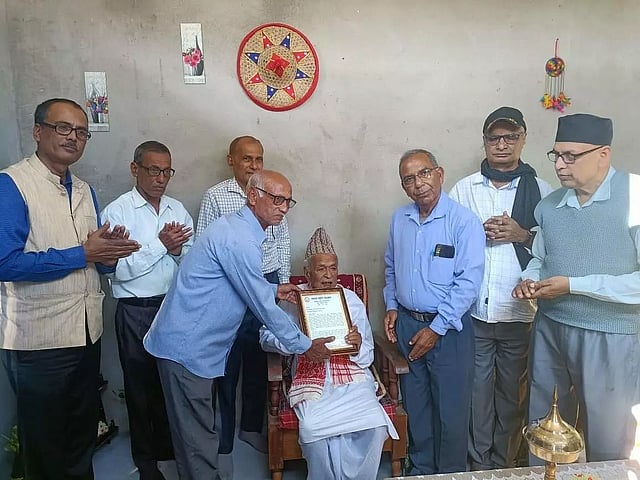 JAMUGURIHAT: A team of Basanta Smriti Sansthan, a memorial trust founded in the memory of emerging writer Basanta Nepal of Balipukhuri, Biswanath, visited the Samar Dalani residence of freedom fighter Hari Prasad Mishra and felicitated him with a citation and a gamosa on Friday. The team comprised its president Hari Upadhyaya, secretary Dr Sanjib Upadhyaya, executive member Dr Bhakta Prasad Gautam and convener Dr Khemraj Nepal. They met the freedom fighter and interacted with him.