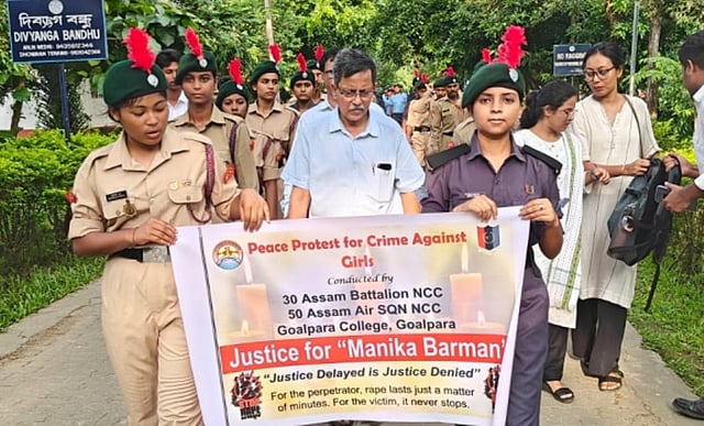 GOALPARA: In a solemn and powerful show of solidarity, the 30 Assam Battalion NCC and 50 Assam Air Squadron NCC, in collaboration with Goalpara College, organized a peace procession on Wednesday to raise their collective voice against the brutal rape and murder of Manika Barman, an NCC cadet of 7 Assam Battalion NCC, Dhubri, and a resident of Bajali district, Assam. The tragic incident occurred on July 19, shaking the conscience of the entire region.