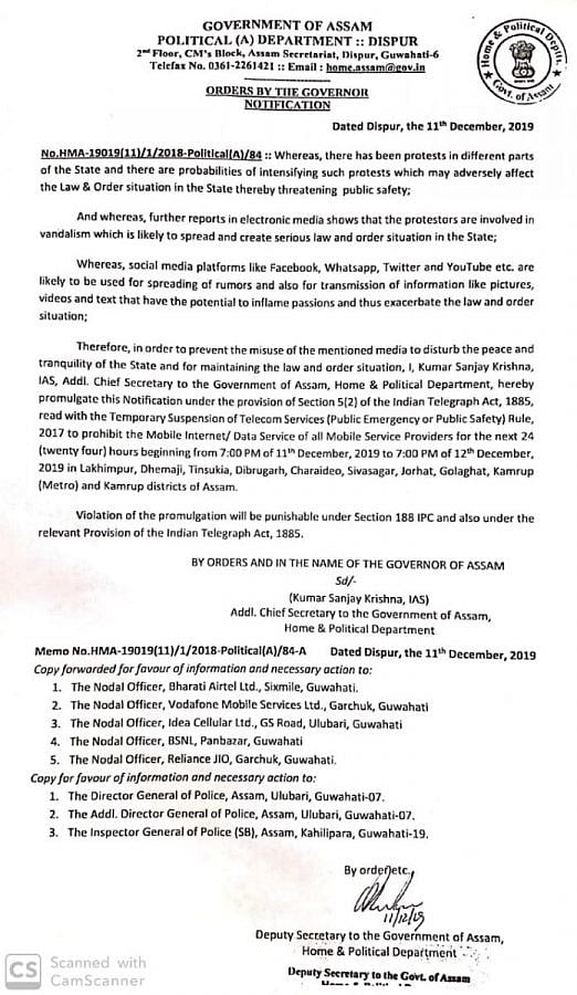 Therefore, in order to prevent the misuse of the mentioned media to disturb the peace and tranquility of the State and for maintaining the law and order situation, I, Kumar Sanjay Krishna, IAS, Addl. Chief Secretary to the Government of Assam, Home & Political Department, hereby promulgate this Notification under the provision of Section 5(2) of the Indian Telegraph Act, 1885, read with the Temporary Suspension of Telecom Services (Public Emergency or Public Safety) Rule, 2017 to prohibit the Mobile Internet/ Data Service of all Mobile Service Providers for the next 24 (twenty-four) hours beginning from 7:00 PM of 11. December 2019 to 7:00 F'M of 12. December 2019 in Lakhimpur, Dhernaji, Dibrugarh, Charaideo, Sivasagar, Jorhat, Golaghat, Kamrup (Metro) and Karnrup districts of Assam.”