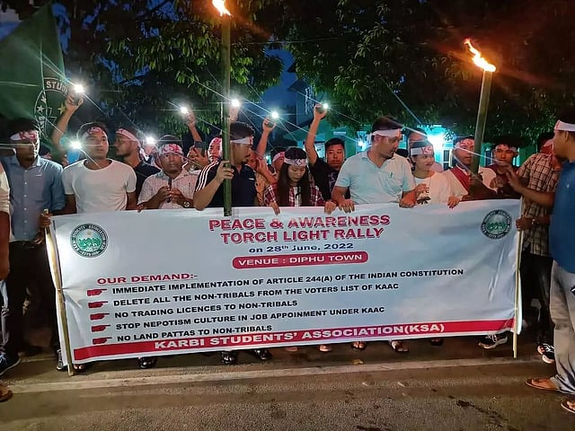 HOWRAGHAT: Karbi Students' Association (Inglongpho faction) took out a torch light procession in Diphu on Tuesday evening demanding immediate implementation of Article 244(A), deletion of names of non-tribals from the voter list of Karbi Anglong Autonomous Council (KAAC), and non-issuance of trading licenses and land pattas to the non tribal people.