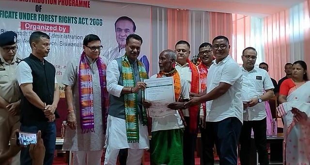 BISWANATH CHARIALI: Under the Forest Land Rights Act, 2006, the Biswanath district administration formally handed over title certificates of land to 2145 claimants living on forest land in the district on Monday. In a meeting held at Kamalakanta Natya Samaj auditorium here, the Guardian Minister of Biswanath, Ashok Singhal, formally started the process of issuing certificates to the claimants who have received the title deeds of the land. It is to be noted that a total of 2145 claimants living in different forest areas under all the assembly constituencies under Biswanath district, namely Biswanath, Behali, and Gohpur, were given the title deeds of this land.