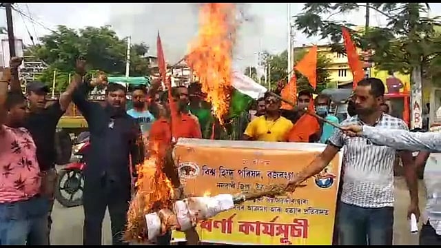 NALBARI: The Nalbari unit of Vishwa Hindu Parishad and Bajrang Dal staged a dharna on Saturday at Gurdon Chowk to protest against the brutal killings of Hindus in Jammu and Kashmir. A teacher in a government school and its principal were shot dead by terrorists in the city's Eidgah area on Thursday. The activists shouted slogans against Pakistan and terrorism. They burnt the national flag of Pakistan. Anup Das of Vishwa Hindu Parishad and Jitumani Kalita of Bajrang Dal also joined the activists.