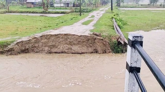 LAKHIMPUR: Heavy shower has lashed the Lakhimpur district along with the neighbouring State of Arunachal Pradesh since Saturday. As a result of it, Dropang River, which flows with rapid current from the hills of Arunachal Pradesh, began to overflow and swept away one approach of the bridge along the Lakhipur-Maghonowa connecting road at No. 4 Tatibahar revenue village under Pichala Gaon Panchayat of Narayanpur Development Block. The overflown water of the river has also inundated five revenue villages under the said Gaon Panchayat namely, No. 2 Tatibahar, No 4 Tatibahar, Maghnowa, Gamtow and Bongson. The breach in the road has paralyzed the communication system in the area adversely affecting the people, students and the examinees of current HS Final exam. However, the villagers on Monday made the road accessible for pedestrians by lying four iron plates that were used in the old wooden bridge.