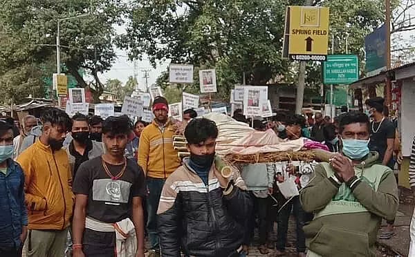 TINSUKIA: The family members of slain fast food vendor Raj Kumar Mahato and activists of All Assam Hindu Yuba Parishad took out a protest funeral carrying his body at Thana Chariali Tinsukia on Wednesday and demanded stringent punishment against the accused, Sugriv Mahato.