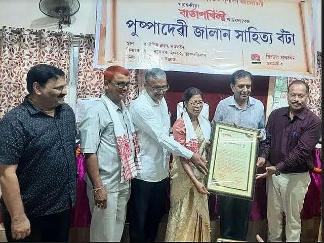 The award conferred under the aegis of monthly news magazine Barta Pakhilee carries a citation, a memento, a bundle of books and cash prize of Rs 21,000. Dr Sarma was selected for her recently published book Asomiya Byanga Sahitya Bisar. Eminent academician and writer Dr Amarjyoti Choudhury ceremonially handed over the award to Dr Dhanashri at a public function organized here at Youth Club on Thursday afternoon.