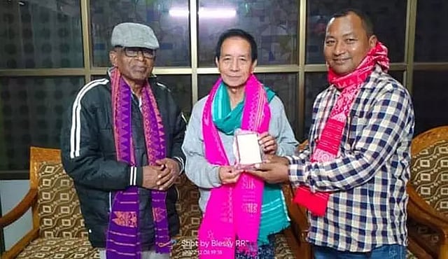 KOKRAJHAR: Synchronizing with the golden jubilee celebration of ordination of Rev. Fr. Khulandai Samy as Priest of Catholic Church, renowned artistes of the Bodos, who acted in the Bodo film Basiram Jwhwlao, produced by Swdwmshree Harimu Afad and run by Fr. Khulandai, were felicitated with traditional Aronai on Tuesday in their respective houses.The artiste who were felicitated by Rev. Fr. Khulandai and his associates from Dularai Boro Ccatholic Ansai Afad (DBCAA) included Tikendrajit Narzary (renowned Bodo film actor), Dr Mongalsing Hazowary, Meghnath Mashahary and Binay Borgoyary. Father Samy wrote the story after studying the history of Basiram Jwhwlao.
