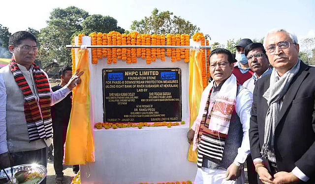 GERUKAMUKH: NHPC, Subansiri Lower HE Project has commenced the works of Downstream River Protection in the Subansiri River covered under phase-III with laying of foundation stone on Thursday by Panchayat & Rural Development Minster Naba Kumar Doley and Member of Parliament, Lakhimpur LS Constituency Pradan Barua, in the presence of Arvind Bhat, Executive Director & Vipin Gupta, General Manager (In-charge), Subansiri Lower HE Project.