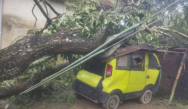 Meanwhile, the power supply has been disrupted since midnight. In Mahuramukh, a tree fell on the private vehicle of a person named Jatin Bora, completely wrecking it.