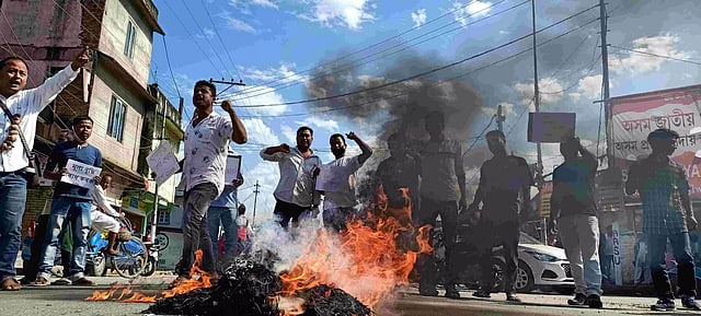 NAHARKATIA: Tai AhomYuvaParishad, Asom (TAYPA) Naharkatiasubdivisional committee burnt the effigy of State Food and Supply Minister PhaniBhushanChoudhury at Naharkatia Moran Tiniali in protest against price hike. Around 50 members of TAYPA took part in the protest wearing potato and onion garlands on their neck and shouting various slogans against the BJP-led Assam Government. Participating in the protest, the president of TAYPA, Naharkatiasubdivisional committee said, "The BJP government has sold itself to the Fancy Bazar traders."