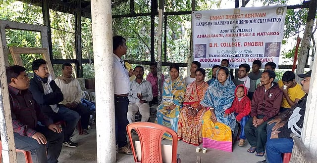 DHUBRI: Training on mushroom cultivation was organized by BN College, Dhubri in collaboration with the Technology Incubation Centre (TIC) of Bodoland University, Kokrajhar at Asharikandi village of Dhubri district recently under Unnat Bharat Abhiyan of the Government of India. Altogether 40 villagers from Asharikandi, Madaikhali and Matiabog have been adopted by the college under Unnat Bharat Abhiyan. The aim of the programme was to train the villagers with the necessary skill to make them self-reliant and move one step ahead towards Atmanirbhar Bharat.