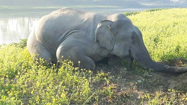 BOKAKHAT: A wild elephant was seen in distress at the Yantan area on the outskirts of Numaligarh. On Saturday, the elephant was found roaming in an ill condition in the Deithor area of Karbi Anglong district. On Sunday, the elephant became unconscious inside the Numaligarh tea garden, following which a Forest Department and rescue team provided it medical treatment. The weak elephant remained unconscious for nearly five hours. After treatment, the elephant showed some improvement by the evening, but it has not fully recovered yet.