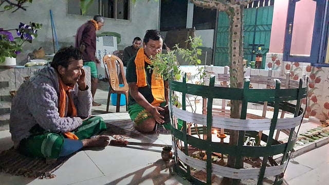 Before serving the special food items, Islary and his family prayed in the Bathou and sacrificed 26 chickens to deities as per Gudi-Bathou traditions. As the farmers depend on bulls and oxes, the families generally offer the first bite of new rice to them and then to guests. The Ojha (Bathou priest) led the prayers and animal sacrifice at Bathou, as sacrificing of animals is part of the Gudi Bathou.