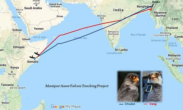 "After spending close to 20 days in Manipur and adjoining areas, the two satellite-tagged Amur falcons – Chiulon and Irang – were out on their second-year migration on November 11 and 12. They have now reached Somalia covering 5,700 km and 5,400 km, respectively, in five-and-half-day non-stop flight."