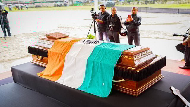 The veteran statesman, draped in the tricolour, was accorded full state honours at Students’ Field, Jaiaw, where leaders across the political spectrum gathered alongside grieving citizens, their umbrellas barely shielding them from the relentless downpour.