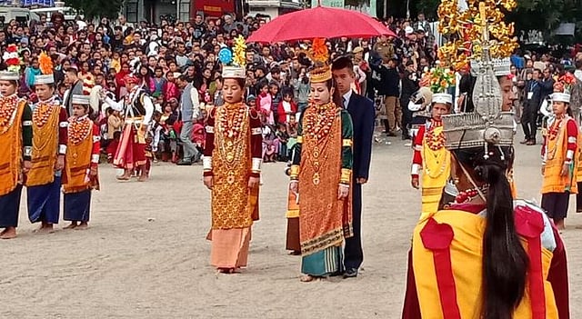 The dances were performed in the courtyard of the Iing Sad (thatched house) where young girls dazzled in traditional attires and danced to the tune of music of the duhalia (the traditional musicians), while the men dressed in traditional accoutre – holding a white yak hair whisk in one hand and a sword in one hand – surrounded the women.
