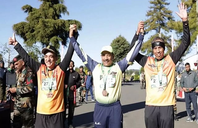 SHILLONG: Three National Defence Academy (NDA) course-mates from the 67 NDA Course batch made history at the third edition of the Assam Rifles Hills Half Marathon at Laitkor, Shillong, on Sunday as they bagged gold, silver and bronze in the over 55-year-old category. Commander AP Venkatesh (NDA Alpha Squadron), a veteran from the Indian Navy, won the gold, Brigadier Sanjay Rawal (NDA Hunter Squadron), a veteran from the Indian Army, won the silver and Lt Gen PC Nair (NDA Hunter Squadron), the Director General of Assam Rifles won the bronze.