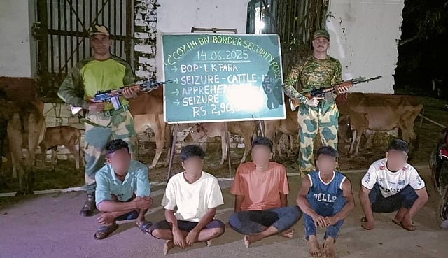 In one major operation, BSF troops of Border Outpost (BOP) Dholakcheri, located in South Tripura district, apprehended five cattle smugglers and rescued 12 cattle from their possession.
