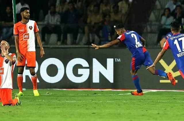 Bengaluru came well prepared and threatened the Goa defence as early as the sixth minute. Nishu Kumar and Sunil Chhetri combined well on the left flank before the latter found Miku at the edge of the box. The Venezuelan striker shimmied his way past a crowd of defenders inside the box but a loose touch at the end of his spectacular solo run allowed goalkeeper Naveen Kumar to get to the ball.