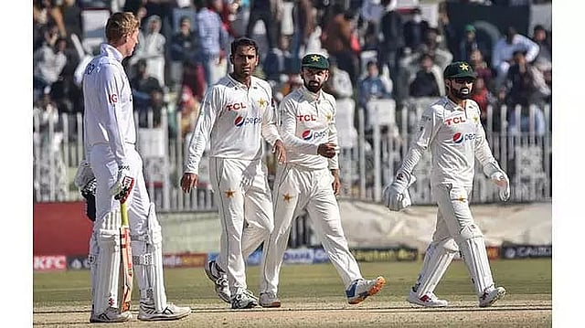 RAWALPINDI (IANS): England's daring declaration set up the potential for a thrilling final day of the first Test as Pakistan were 80-2 at stumps on Day 4 and needed 263 more runs to win, here on Sunday.