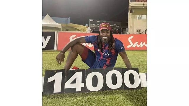 Gayle became the first batsman to reach the 14,000-run landmark in T20s during West Indies's victory over Australia in the third match on July 13 (IST). Gayle smashed seven sixes and four fours as he top-scored with 67 off 38 balls as West Indies clinched the series 3-0 with two matches still to be played.