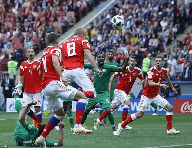 Russia got their third goal from Dzyuba, who scored in the 71st minute, one minute after coming as a substitute for Fedor Smolov. Golovin made his second assist of the game as his cross from right saw Dzyuba outjump Saudi captain Osama Hawsawi and head it in.