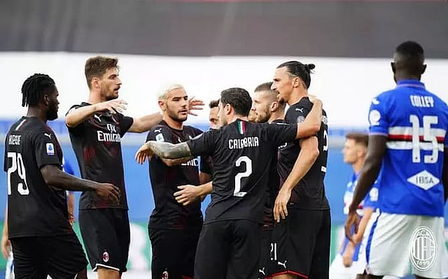 Veteran AC Milan forward Zlatan Ibrahimovic scored twice and Gianluigi Donnarumma saved a penalty as they won 4-1 at Sampdoria to stay unbeaten since the Serie A season restarted.