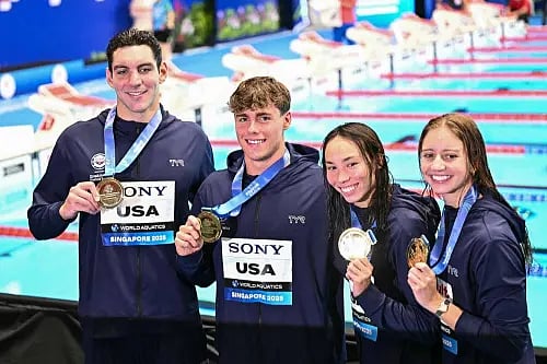Jack Alexy, Patrick Sammon, Kate Douglass, and Torri Huske were the members of the United States of America team.