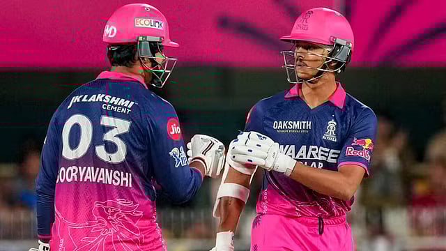 Jaiswal welcomed Trent Boult with sixes off his first two balls, as the bowler strayed onto the pads on the first delivery and went down outside off on the next. A single later, Sooryavanshi hammered a big one, picking a shortish delivery off his pads to plant it into the stands over deep backward square leg as RR blazed to fifty in just 16 balls.