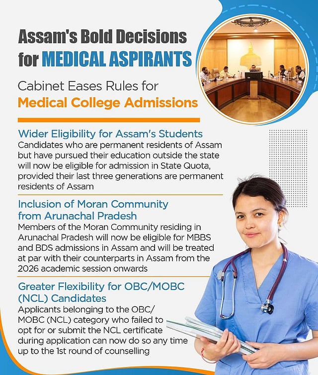 Under the new policy, Moran students from Assam and Arunachal Pradesh will be treated at par, ensuring they enjoy equal rights in medical admissions. In another student-friendly decision, Assamese students studying outside the state will still be eligible for State quota seats, reaffirming that the children of Assam will never lose their connection to their homeland.