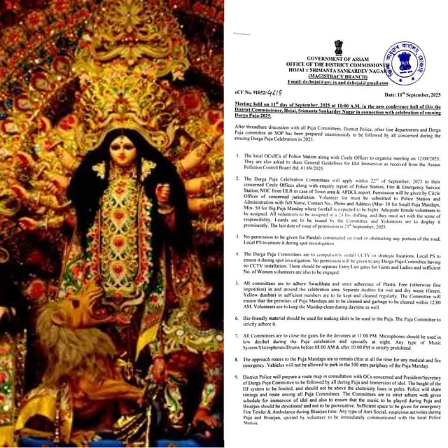 Deputy Comissioner Bidyut Bikash Bhagawati said the directives will remain in effect from the opening of the Puja to the immersion of idols on Vijaya Dashami. Committees have been instructed to obtain mandatory permissions from the Revenue Circle Officer through their respective police stations before setting up pandals.