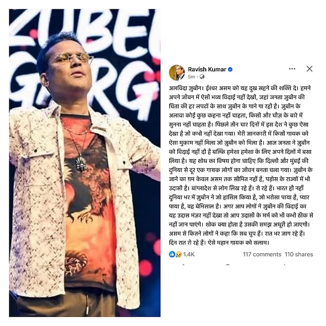 Guwahati: Veteran journalist Ravish Kumar has penned an emotional tribute to Assam’s cultural icon Zubeen Garg, describing the singer’s farewell as a once in a lifetime moment of mourning that transcended boundaries.