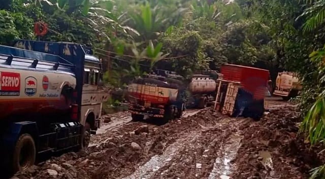According to Kolasib district authorities, 316 empty trucks bound for Assam and 401 goods-laden trucks heading to Aizawl have been stuck due to the deteriorating road surface along the Sairang-Kawnpui stretch. The National Highways and Infrastructure Development Corporation Limited (NHIDCL) has begun emergency repair work with assistance from the Mizoram Public Works Department.