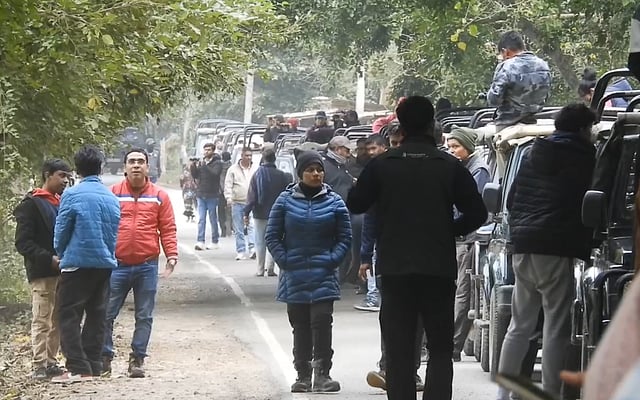 The Kohora range, particularly the Mihimukh entry gate, presented a spectacular sight on Wednesday morning as long queues of safari jeeps stretched as far as the eye could see. Tourists boarded the jeeps to explore the beauty of the park, creating a lively and celebratory mood, filled with excitement and curiosity.