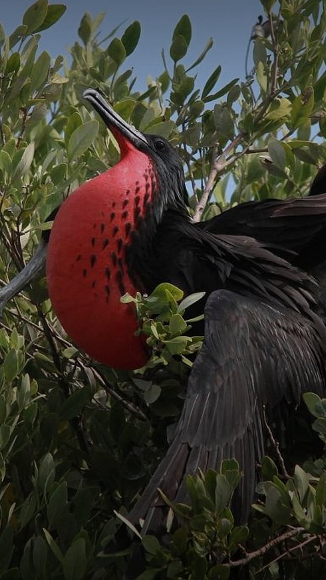 Frigatebirds are a blackbird family with massive beaks and males with massive gular pouches.