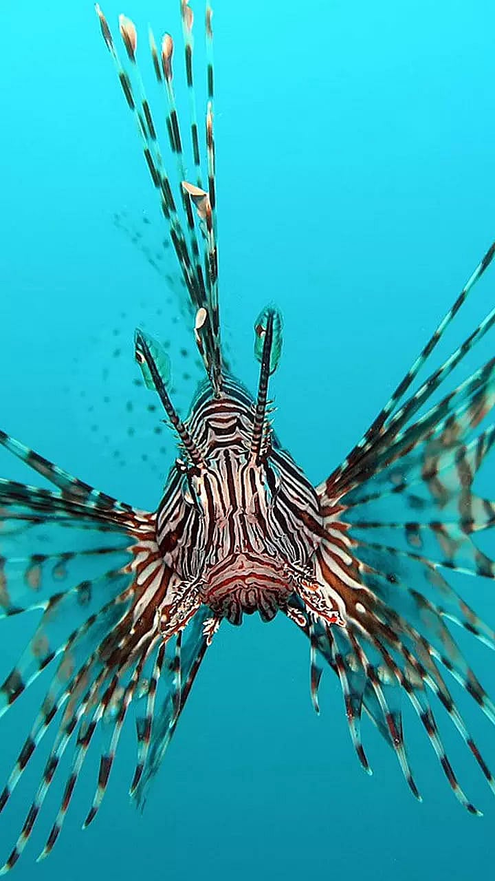 Lionfish are incredibly venomous fish that are native to the Pacific Ocean, although they have now invaded many other oceans. They reach around 18 inches long and are characterized by their bright colors. Lionfish can have red, white, or black bands and have spiky fin rays which are venomous.