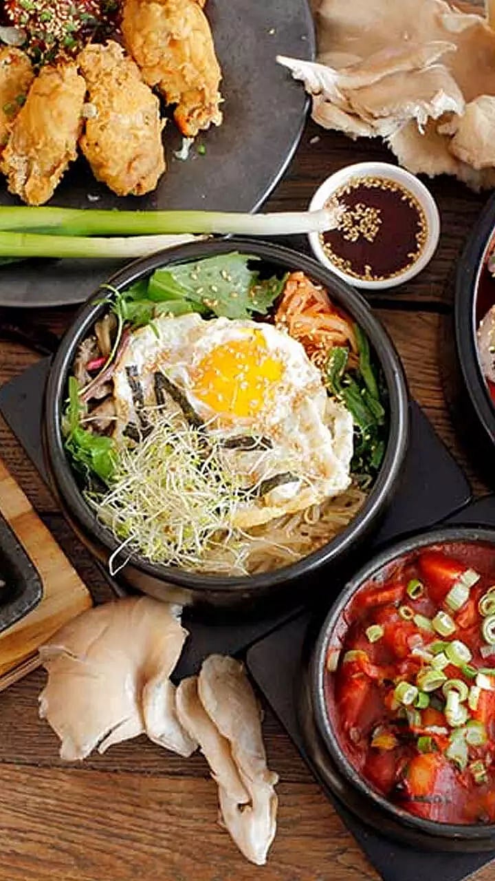 The most common bibimbap consists of warm rice topped with mixed vegetables, beef or chicken, and raw egg, as well as soy sauce and a dollop of chilli pepper paste for seasoning.