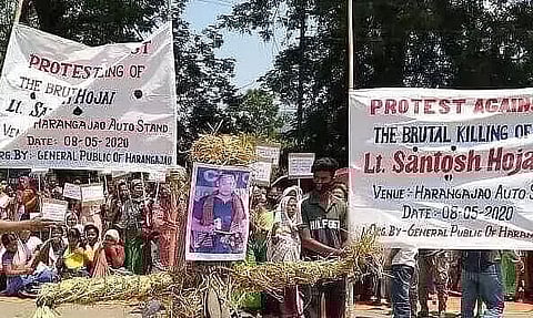 HAFLONG: In protest against the brutal killing of Santosh Hojai and demanding immediate arrest of Surjyakanta Morang, DSP HQ and CBI inquiry into the kidnapping of Santosh Hojai, various organizations along with general public of Harangajao staged dharna at Harangajao autostand on Friday. Hundreds of people taking part in the demonstration shouted various slogans.