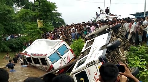 Both the Traveller buses slide off the road and fell over each other into a roadside pond.