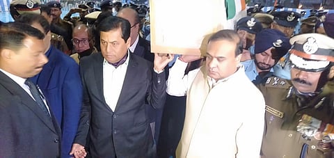 Both the leaders were seen lending shoulders to the mortal remains of the brave Assam son today at LGBI Airport in Guwahati.