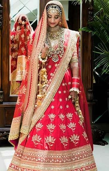 It’s official, Sonam Kapoor and Anand Ahuja tied their knot in an intimate ceremony in the presence of their families and close friends. As Sonam always wanted a private wedding ceremony with family and close friends, they two got hitched at a heritage bungalow in Bandra today as per the Sikh rituals. Sonam looked beautiful in red lehenga as a bride she choose to pick Anuradha Vakil Creation for her wedding day.