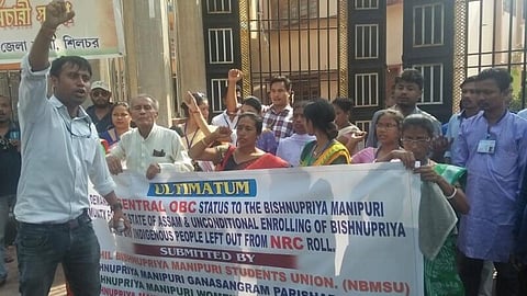 SILCHAR: Hundreds of leaders and activists under the banner of Nikhil Bishnupriya Manipuri Students’ Union (NBMSU) and Bishnupriya Manipuri Ganasangram Parishad (BMGSP) to day hit the streets of this town and after marching down, raising slogans, assembled before the office of the Deputy Commissioner Laya Madduri, and submitted a memorandum to her on twin demands. But before that they held protest demonstration with banners in their hands, highlighting the pressing demands. And with that, the organizations also served an ultimatum on the district administration to initiate measures for acceding to their demands.