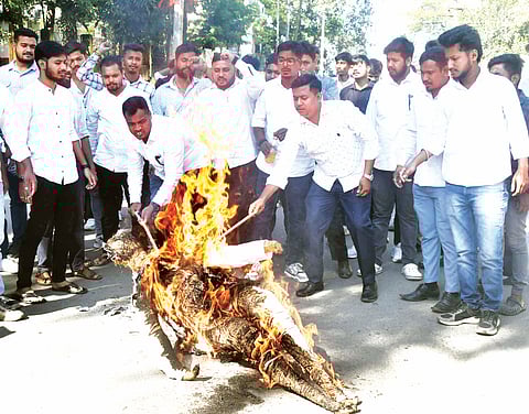 Guwahati: The activists of All Assam Students’ Union (AASU) staged a statewide protest against the alarming price hike of essential commodities on Monday. They also burnt an effigy of Supply Minister Ranjeet Kumar Dass. The protest was conducted in MG road in Guwahati. AASU condemned the price rise issue in an official statement. AASU has called upon all regional student unions across Assam to protest in their respective local markets, demanding an explanation from the Minister of Food and Civil Supplies, Ranjeet Dass, regarding the failure to control the price hike. They raised slogans such as “Shame on the Minister of Food and Civil Supplies,” “The Market is on Fire; the Public is in Distress,” among others, as part of the protest against the price hike.