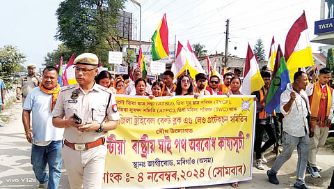JAGIROAD: The All Tiwa Students Union (ATSU), in association with other few ethnic organizations, took out a protest rally on a 4-lane highway at Jagiroad on Monday, demanding not to constitute Jagiroad Town Committee, inclusion of the Tiwas in the 6th schedule of the Constitution, eviction of illegal encroachers from the Tribal belts and blocks, and removal of smart meters of the APDCL. The Morigaon district administration headed by Jagiroad Co-district Commissioner, Biman Das, Mayong Revenue Circle officer Priyanka Gogoi, police, and paramilitary forces later cordoned the area and did not allow the rally to proceed further. The agitators submitted a memorandum to the Chief Minister through the co-district commissioner, demanding fulfilment of their eight longstanding demands.