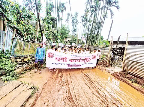 Guwahati: The approach road to Chandrapur College and Chandrapur Senior Secondary School from the Narengi-Bhakatpur State Highway remains covered with a layer of muck during the rainy season, giving the users of this road a nighmarish experience. The Chandrapur Anchalik Chatra Santha staged dharna on the road today in support of their demand for the construction of the road in a scientific way.
